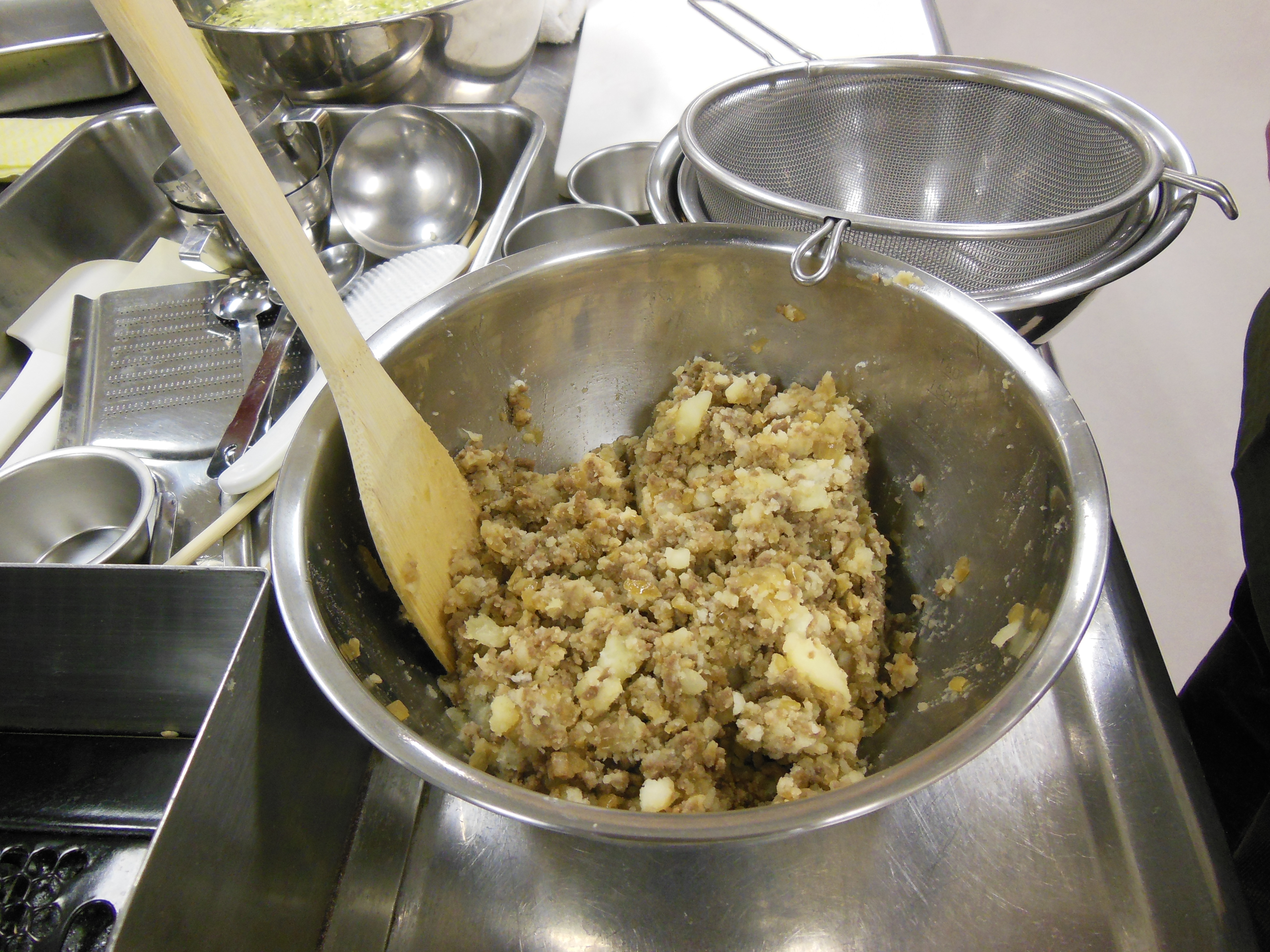 芋を潰して、炒めた玉葱&牛肉と混ぜて